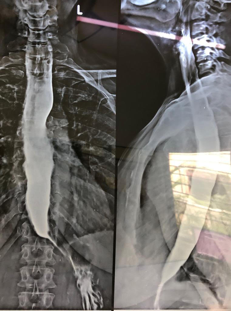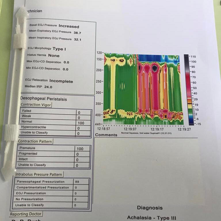 60 year short statured female with copd had dysphagia EGD Scopy confirmed a aperistaltic esophagus with classical ‘give way’ at the esophago gastric junction. Barium swallow and HR manometry done.